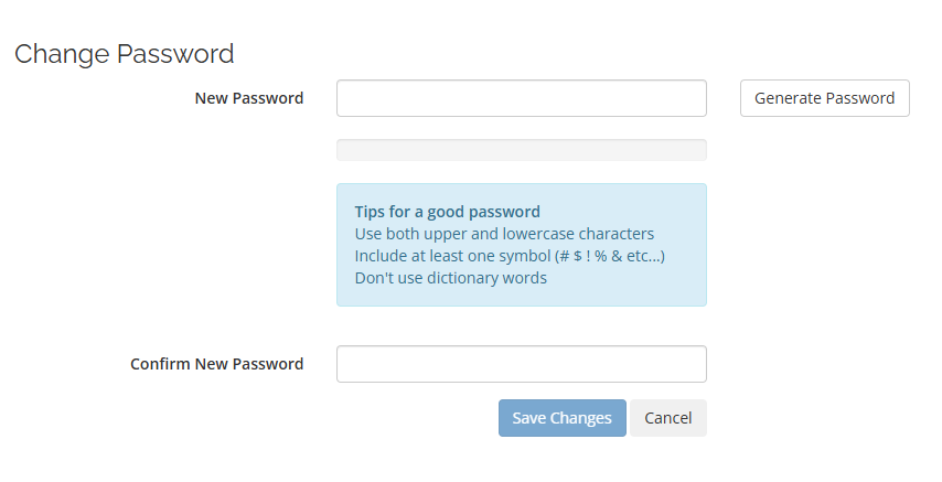 - On this page you can set your billing password by filling in the fields as shown on the image below with your current password and your new password.